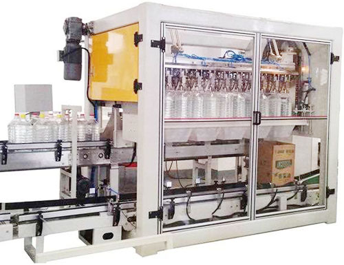 該款全自動(dòng)裝箱封箱機(jī)根據(jù)客戶包裝要求, 對(duì)產(chǎn)品進(jìn)料進(jìn)行準(zhǔn)確分道分組,同時(shí)由吸送紙板機(jī)構(gòu)將包裝用紙箱同步送至固定位置,再由氣動(dòng)部分將分組好的產(chǎn)品推進(jìn)紙箱位置,由成型折疊機(jī)構(gòu)和噴膠粘合裝置協(xié)調(diào)工作來完成產(chǎn)品的終完整紙箱包裝;各個(gè)部分的同步是由數(shù)臺(tái)伺服電機(jī)及機(jī)械調(diào)整同步來完成,以保證每組產(chǎn)品包裝的準(zhǔn)確、合格、美觀。